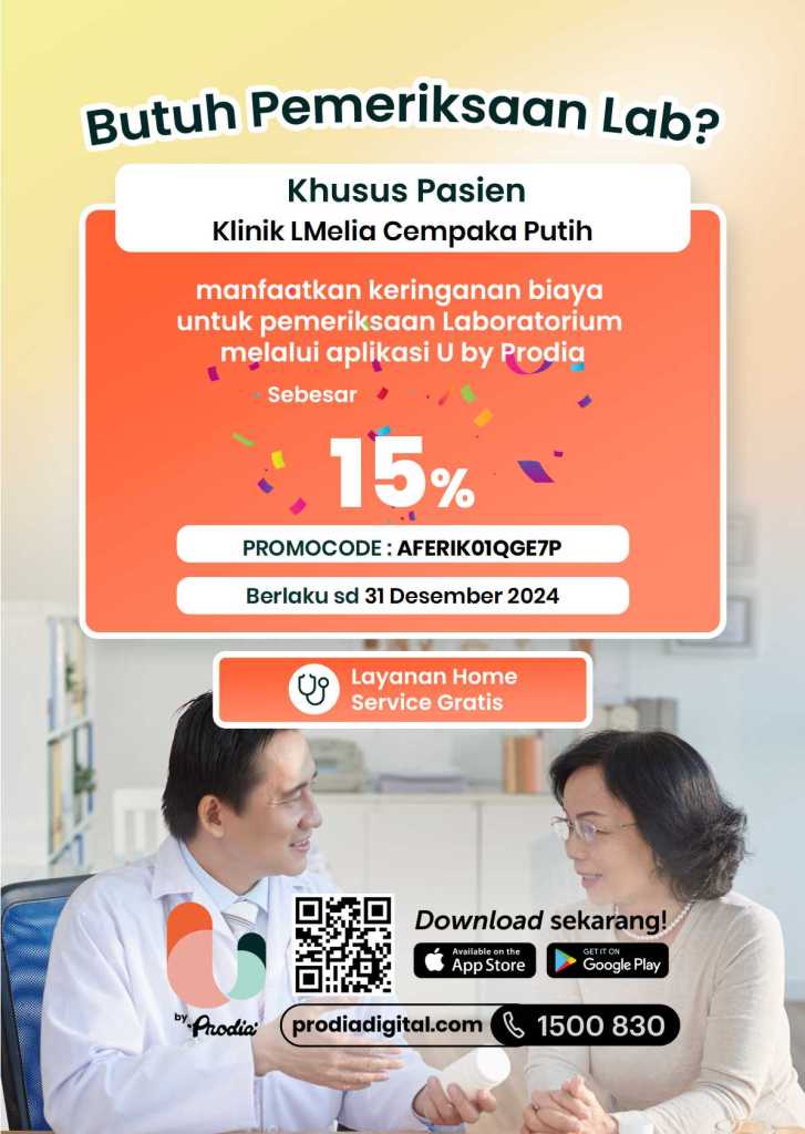 Berita gembira bagi pelanggan Klinik Kecantikan LMelia Cempaka Putih. Kami peduli dengan kesehatan Anda. Bekerjasama dengan Laboratorium Klinik Prodia, pelanggan LMelia bisa memperoleh diskon 15% hanya dengan menggunakan kode voucher
