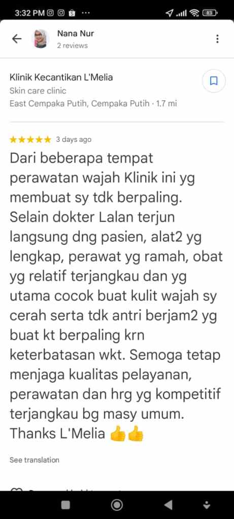 Dari beberapa tempat perawatan wajah, Klinik ini (maksudnya Klinik Kecantikan LMelia Cempaka Putih Jakarta Pusat) yang membuat saya tidak berpaling. Selain dr Lalan terjun langsung dengan pasien-pasiennya, alat-alat yang lengkap, perawat yang ramah, obat relatif terjangkau dan yang utama cocok buat kulit wajah saya sehingga menjadi cerah. Juga tidak antri berjam-jam yang buat kita berpaling karena keterbatasan waktu.