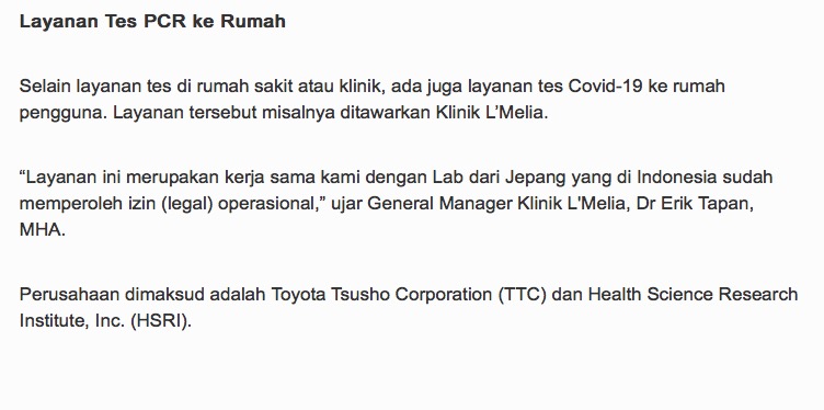 Layanan Tes PCR ke Rumah Selain layanan tes di rumah sakit atau klinik, ada juga layanan tes Covid-19 ke rumah pengguna. Layanan tersebut misalnya ditawarkan Klinik L’Melia. “Layanan ini merupakan kerja sama kami dengan Lab dari Jepang yang di Indonesia sudah memperoleh izin (legal) operasional,” ujar General Manager Klinik L’Melia, Dr Erik Tapan, MHA. Perusahaan dimaksud adalah Toyota Tsusho Corporation (TTC) dan Health Science Research Institute, Inc. (HSRI).